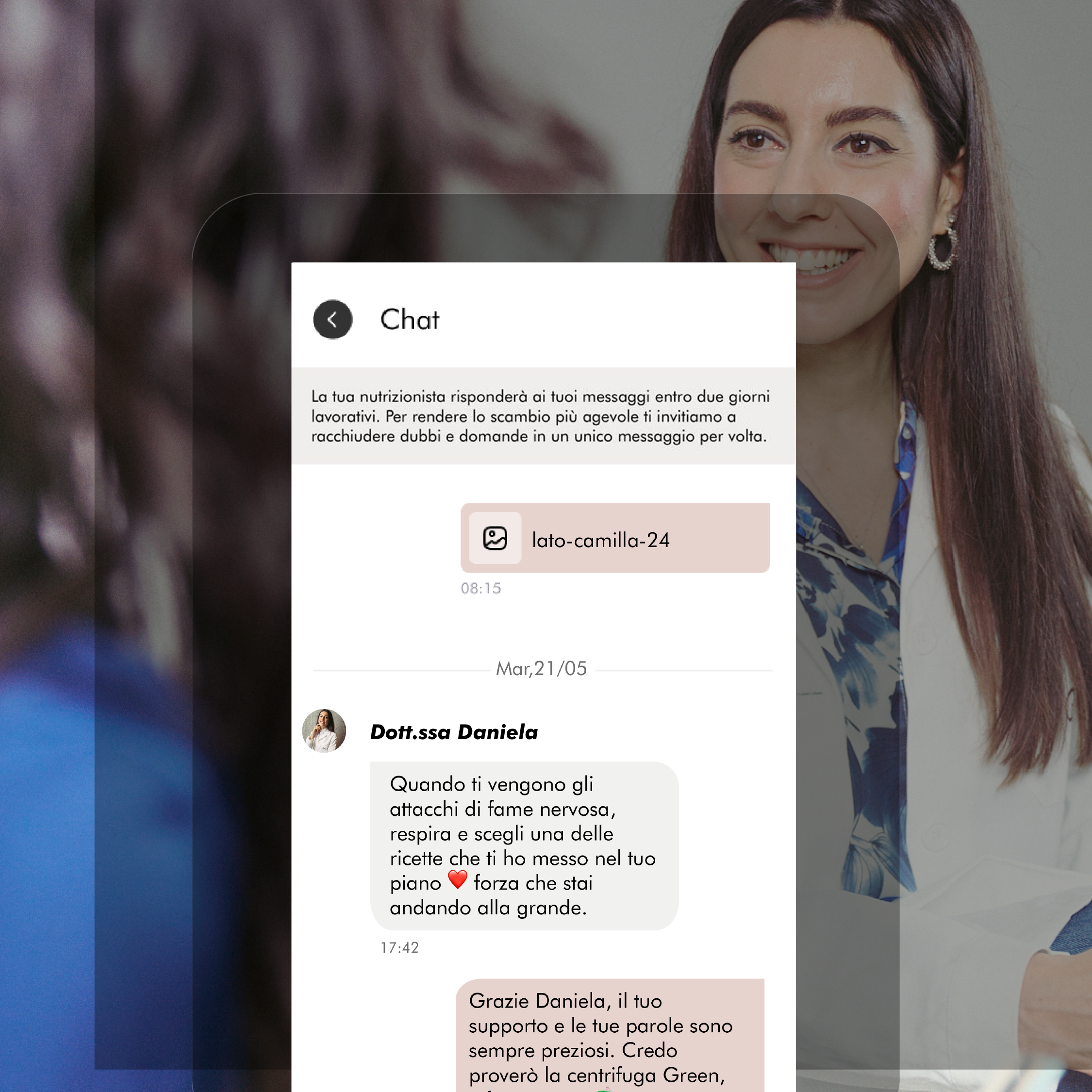 Per qualsiasi domanda, curiosità e supporto, la tua Nutrizionista sarà sempre a disposizione direttamente nella tua App: potrai scriverle attraverso una chat privata.